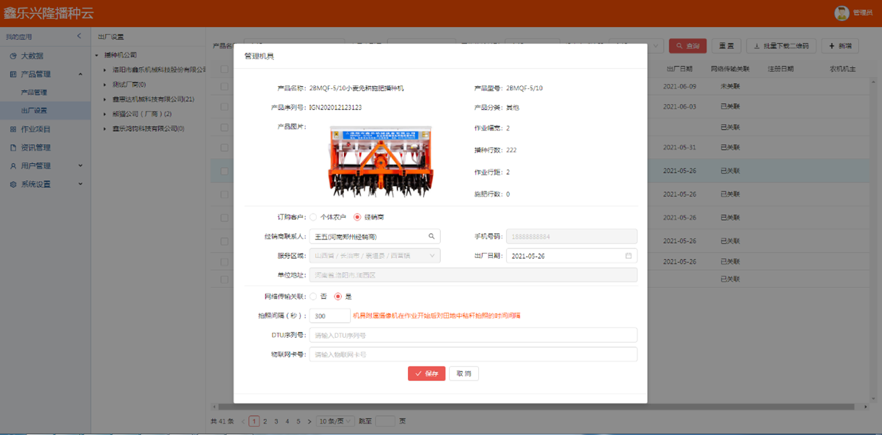 • 作業(yè)項(xiàng)目:為播種機(jī)(農(nóng)機(jī))生產(chǎn)廠家和播種機(jī)(農(nóng)機(jī))經(jīng)銷(xiāo)商提供作業(yè)項(xiàng)目跟蹤服務(wù)的功能。