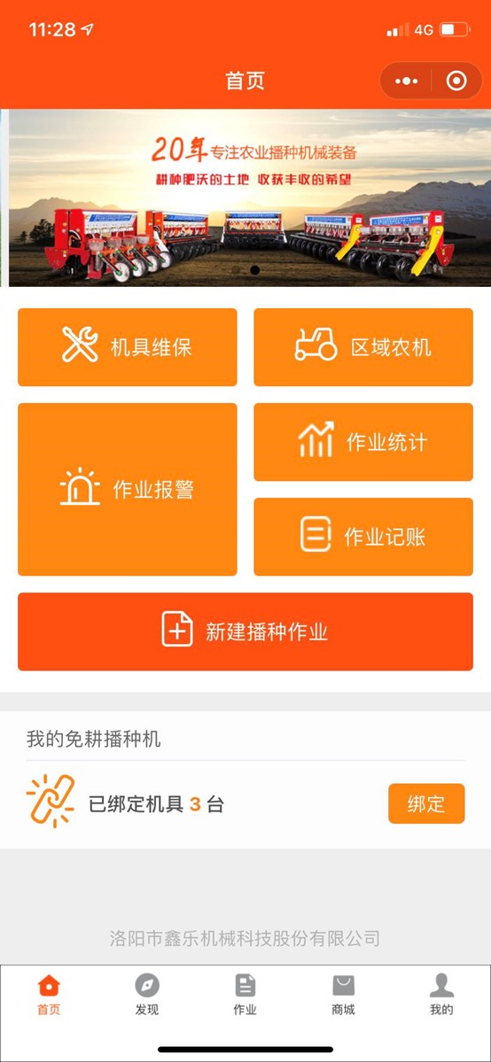 • 首頁(yè):為登錄用戶(hù)提供創(chuàng)建作業(yè)、機(jī)具維保、區(qū)域農(nóng)機(jī)、作業(yè)報(bào)警、作業(yè)統(tǒng)計(jì)及作業(yè)記賬等重點(diǎn)功能的快捷入口。