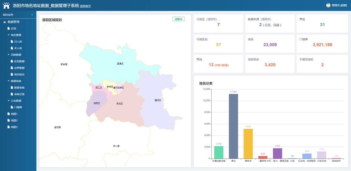 • 地名管理:地名規(guī)劃、更新維護、衍生業(yè)務(wù)、地名標(biāo)志、界線界碑、不規(guī)范地名排查等